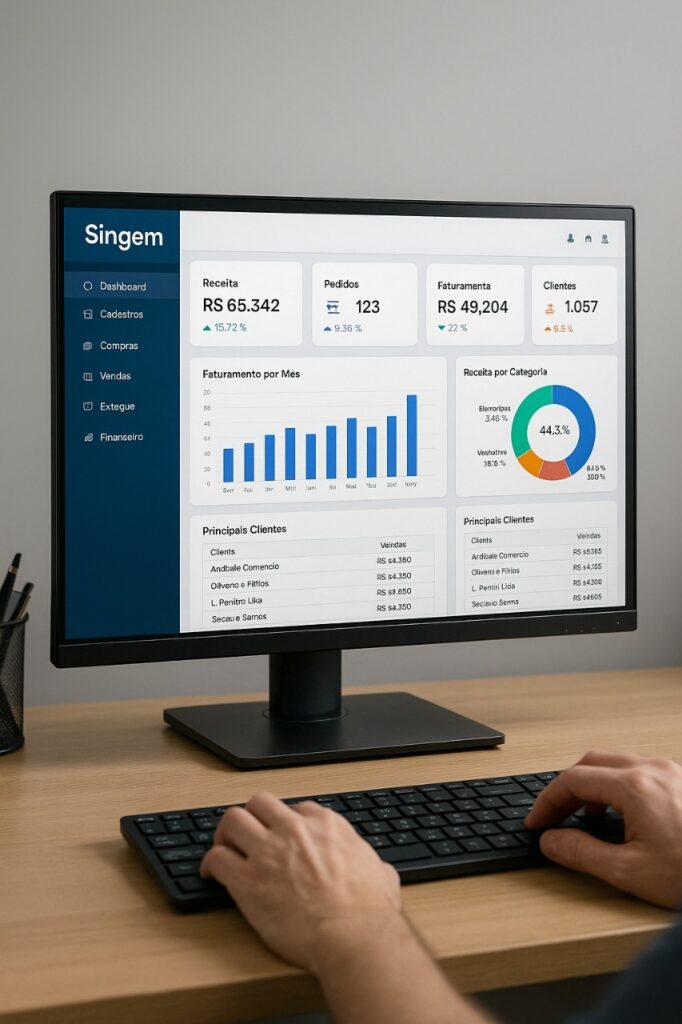 O SINGEM se apresenta em duas versões, Web e Lite, adaptando-se ao porte e às necessidades de cada empresa. Entre seus principais recursos estão emissão de NF-e, controle de estoque, gestão financeira, CRM, aplicativo móvel e relatórios que dão visibilidade ao que realmente importa. O ERP foi desenhado para reduzir ruído e apoiar decisões com BI integrado, transformando dados em informação estratégica.